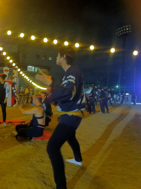 やぐらの周りでは、6つの和太鼓の会がそれぞれ曲に合わせて太鼓を叩きます。